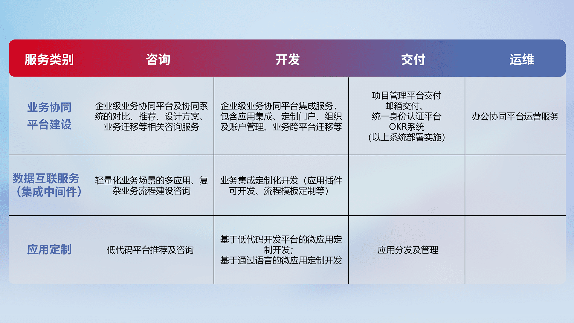 针对钉钉、、、、企微、、、IDaas等平台级产品提供产品的规划、、、、方案、、、、交付、、定制化开发等服务,,实现如统一协同办公、、、智能客户服务、、混合会议管理、、、智能数据查询、、等业务场景,,实现数字化转型。。。